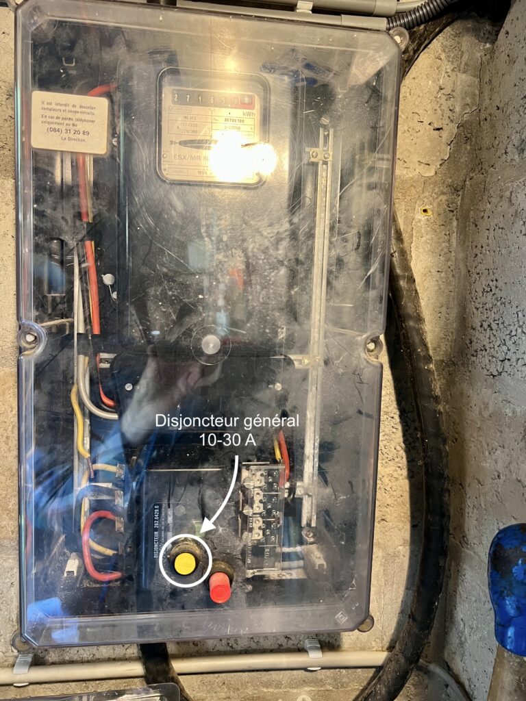 Il y a un disjoncteur triphasé lié au compteur calibré à 20A ! si on dépasse cette puissance (taques électriques à induction), le général saute (bouton jaune a repousser, utiliser moins de puissance au niveau des taques de cuisson.