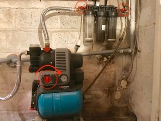 En arrivant, ouvrir la vanne rouge (en position horizontale) à gauche des filtres situé sur le mur extérieur de la cave