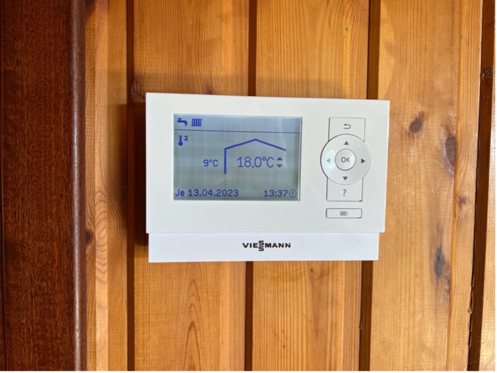 Réglages du thermostat à côté de la porte de l’escalier qui mène à la cave (aussi accessible à distance) :
